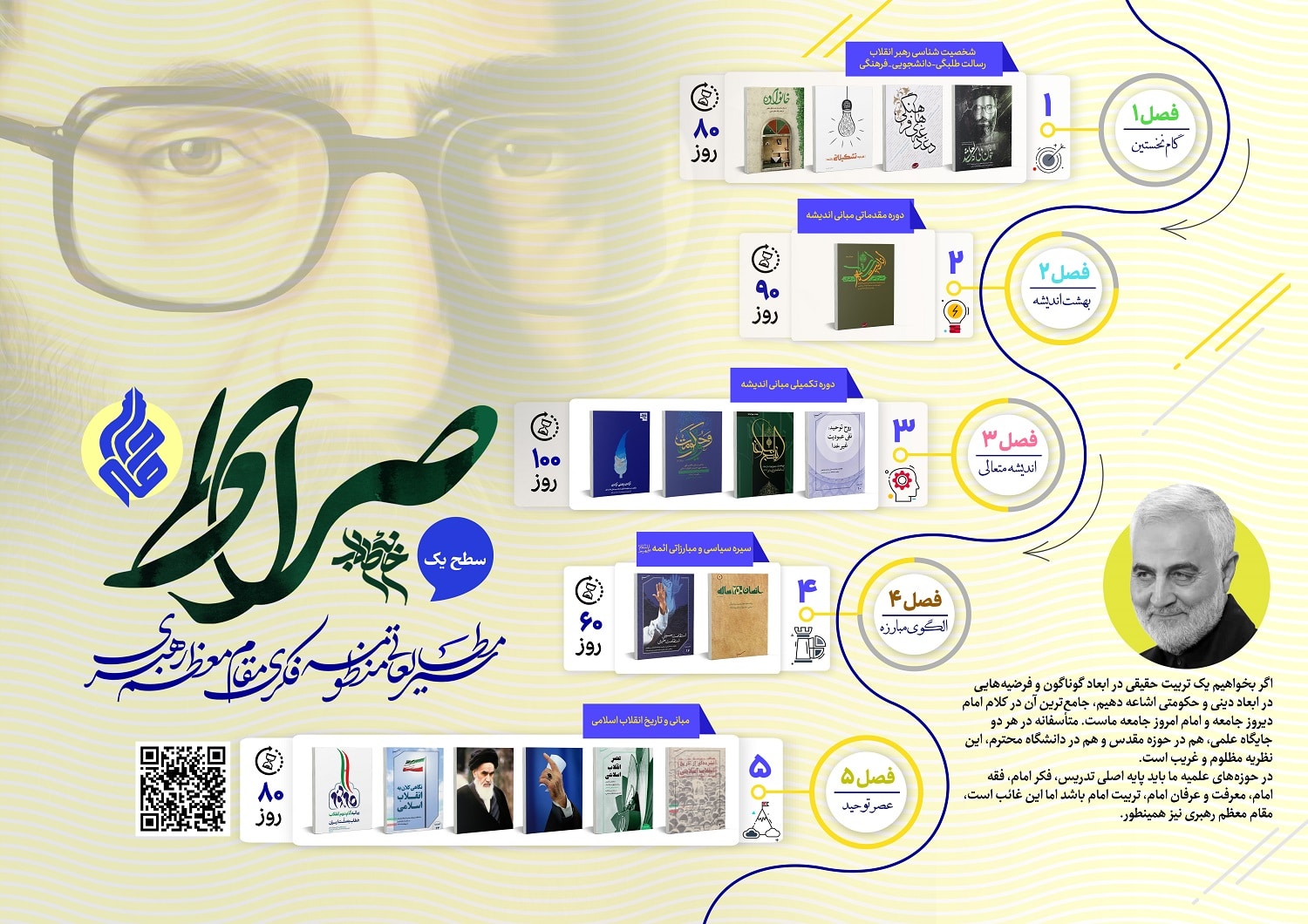 این سیر مطالعاتی، برنامه‌ای منظم و هدفمند است که در پنج فصل طراحی شده و هر فصل به بررسی موضوعات خاصی می‌پردازد. این سیر به شما کمک می‌کند تا با مطالعه کتاب‌های منتخب، به درکی جامع و عمیق از مفاهیم اسلامی، انقلابی و تاریخی دست یابید. در ادامه، هر فصل به‌تفصیل توضیح داده می‌شود.