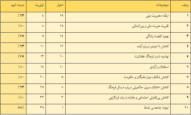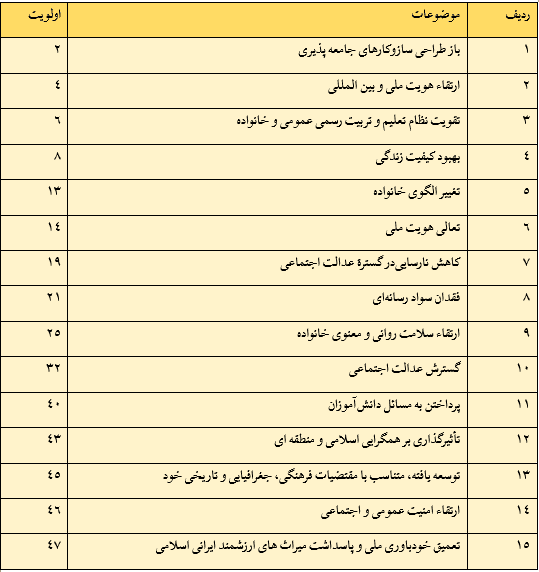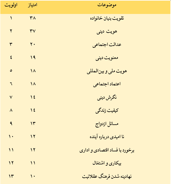 • تقویت بنیان خانواده، هویت دینی، عدالت اجتماعی، معنویت دینی، هویت ملی و بین‌المللی، اعتماد اجتماعی، نگرش دینی، کیفیت زندگی و مسائل ازدواج در صدر اولویت‌ها قرار دارند.