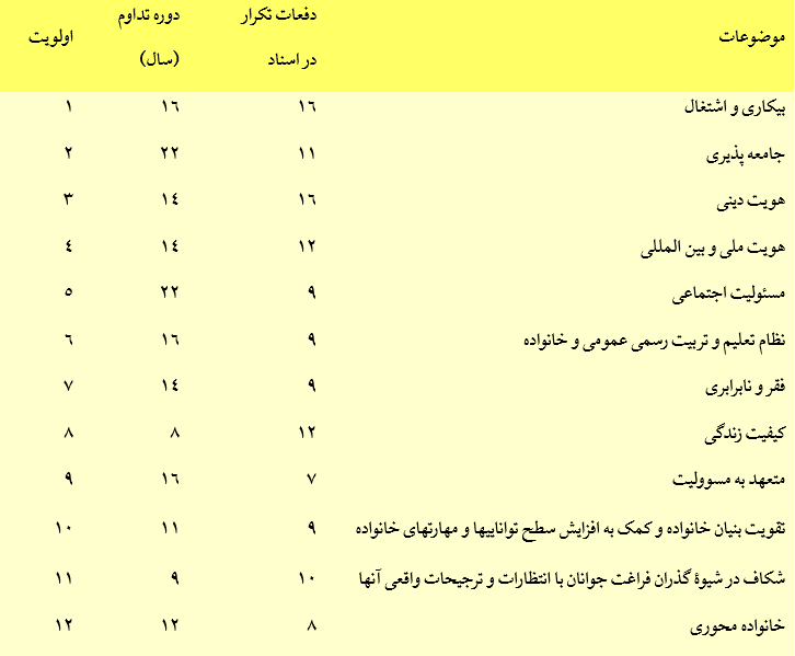 • بیکاری و اشتغال، جامعه‌پذیری، هویت دینی و هویت ملی و بین‌المللی به عنوان موضوعات پرتکرار در اسناد و دارای دوره تداوم بالا شناخته شده‌اند.